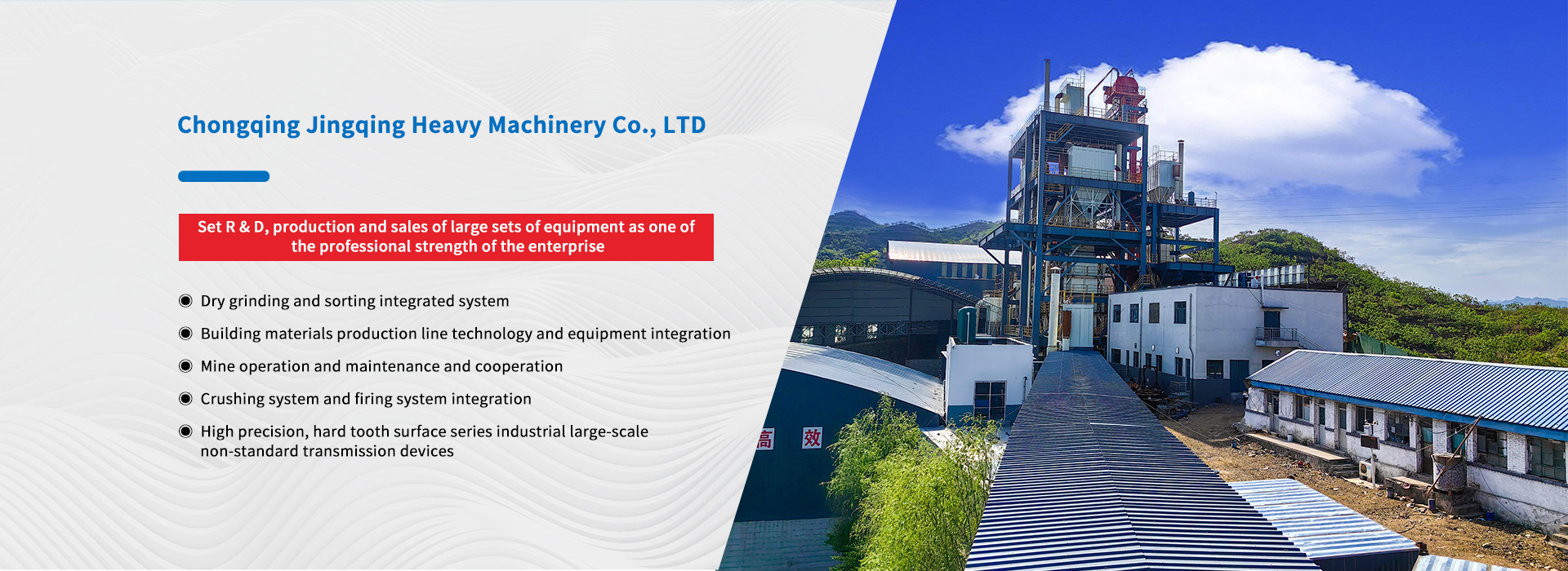 Chongqing Jingqing Heavy Machinery Co., Ltd. (referred to as Jingqing Heavy Machinery), established in the year 2000, is located in Chongqing, China. It operates with its wholly-owned subsidiary, Chongqing Watson Machinery Manufacturing Co., Ltd. The company specializes in the research and development of a series of products, including technology and equipment integration for dry grinding and sorting integrated systems in ore processing production lines, operation and maintenance, cooperation, technology, and equipment integration for building material production lines, high-precision, hard-toothed industrial large-scale non-standard transmission devices, as well as the development of series products in crushing systems and firing systems integration. Jingqing Heavy Machinery is a national high-tech enterprise that integrates research and development, design, production, and sales.